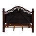 Invite this luxurious European style Messina Estates poster bed into your bedroom. The finish is accented by acanthus leaf carvings on the square posts. Scrolled metal accents in the headboard along with heavy bead molding add to the traditional design of the bed. Crafted with poplar solids and wormy cherry veneer, this piece features bolt-on rails and a center supported slat bed ensures that the bed is sturdy and reliable.
