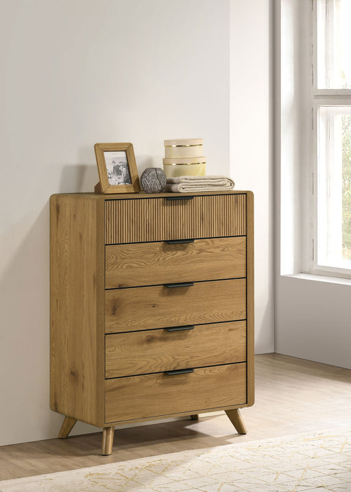 Coaster5-drawer chest of drawers brings vertical storage into a calm corner, where shadow and lamplight play across sculpted fronts. Dark oak tones show o...