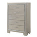 The Platinum 5-Drawer Chest adds instant Platinum to your bedroom! This stylish chest of drawers comes with five, spacious drawers. More than enough space to store all of your belongings. The vertical chest features clean, sleek lines and stylish bracket feet. Mirror glass trim accents the front of the chest, while chrome drawer handles with crystal-like accents bring the glam to your bedroom. This chest of drawers is finished in a chic, champagne color making it easy for this style to transition with every style phase you go through.