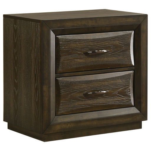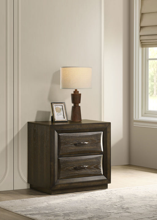 Coaster2-drawer nightstand with bevelled arched fronts brings sculpted depth beside the bed, catching low lamplight with quiet definition. Dark oak tones ...