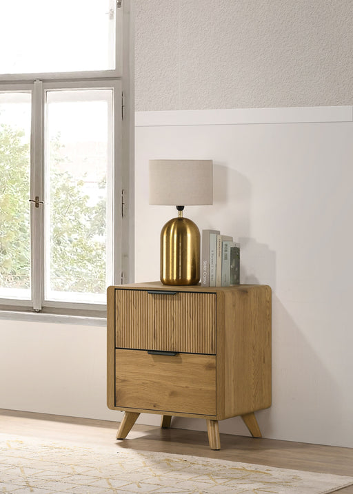 CoasterNightstand keeps the bedside feeling intentional, with two drawers set inside a softly rounded case finished in light oak. The upper drawer shows v...