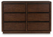 Casual contemporary styling with a decidedly modern vibe. This dresser is warm and inviting with a rich dark brown finish, adorning your restful retreat with on-trend elegance. Full-length metal pulls in a matte black finish add a subtly cool touch to spacious storage drawers. What a simply stunning way to achieve the bedroom of your dreams.