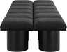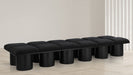 Bring valuable seating and remarkable style to your space with this Pavilion Boucle Fabric Bench, an exquisite balance of style and usability for the entryway, bedroom, and beyond. Crafted from oak veneer with a black finish, this bench has a 4-inch-thick seat cushion that's channel-tufted for a touch of luxury. The bench's columnar bases add a dash of Art Deco design, making it a captivating focal point in any room.