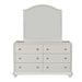 Glam Girls Bedroom with Arched panel bed features tufted white vinyl upholstery with crystal buttons. The stardust features irdescent white Finish. Cases feature softly rounded corners and step molding for added dimension and bun feet. Bead molding frames each drawer.