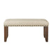 The Jax Dining Bench gives your dining room a hint of rustic charm. Its comfy seat is upholstered in a charming linen and accented by metal nail heads. Cherry finished legs featuring distress marks give this bench a weathered and cozy look.