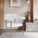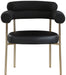 Comfort comes to mealtime with this Blake boucle fabric and vegan leather dining chair. This lovely chair is just the right choice for your modern dining room, with its curved back that cradles you in comfort while you wine and dine the night away. A thickly padded soft lack vegan leather seat lends this chair a sleek, upscale look while ensuring its ongoing performance and beauty. The chair's brushed brass finish protects its all-metal iron frame.