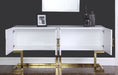 Ensure the items you need at mealtime are close at hand with this handsome Beth Sideboard Buffet from Meridian Furniture. This indispensable piece is a modern marvel with its contemporary design featuring lacquer with a stainless steel trim and base. Open the doors to reveal a large area that's suitable for storing everything from serving bowls to out-of-season dinnerware.