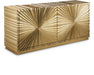 Bring home this Golda sideboard buffet to give your dining room an instant burst of style and glamour. The intricately hand-carved design features a starburst look that makes it a fitting addition to your contemporary space. The gold leaf finish is glamourous and glitzy, and when you open the doors to the unit,you'rell find ample storage space for holding everything from extra dishes and serving pieces to flatware and silverware.