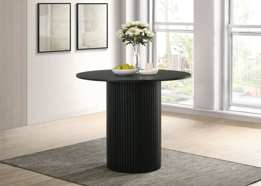 CoasterRound counter height dining table features a thick top and a fluted pedestal base that adds quiet texture without visual clutter. Built with rubber...