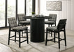 • Counter height dining table in black features a 43-inch round top and fluted base