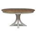 Wow family and friends with the Farmhouse Reimagined five-piece pedestal table set. Crafted of pine and poplar solids with hickory and pine veneers, this set features an antique finish with heavy wire brush distressing and a chestnut top and consists of the pedestal table and four splat back side chairs. The pedestal table features a 12” removable leaf that is anchored by architectural curved legs to form a pedestal that flows into bracket feet. The splat back side chairs offer beautiful detail on the back and has a padded upholstered seat in a khaki linen fabric with tapered legs and nylon chair glides to protect your flooring. Farmhouse Reimagined offers looks that easily work in today’s homes with style uncompromised and comfort abound.