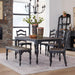 Sitting pretty with the Magnolia Manor leg table set. Crafted of poplar solids and oak birch veneers, this kit features an antique finish with a weathered top with whitewash. The table offers a fancy face dining top, softly rounded corners, one 12-inch removeable leaf to easily accommodate guests or a larger family and is anchored by heavily turned legs. The chairs showcase the perfect blend of European design with nylon chair glides to protect your flooring, and an arched back with wooden saddle seat, anchored by beautifully turned legs. Warm antique finishes and artistic distressing along with grand scale create a piece to be passed to generations.