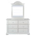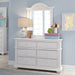 Live life beautifully with the Summer House I panel bed, dresser, and mirror. Crafted of poplar and pine solids this kit features an oyster white finish, bead molding, bun feet, full extension drawers with felt lined top drawers, and is accented with wooden knob hardware. The panel bed features louvered panels and arched crown molding. The dresser has six drawers of storage and pairs well with the arched louvered panel mirror with a beveled edge and bolt-on supports. With cottage design always in fashion, make the Summer House I a staple in your home.