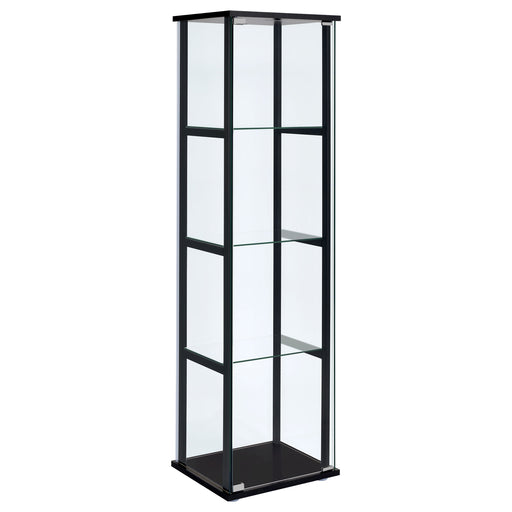 CoasterCurio cabinet with four clear glass shelves and a tall, open silhouette creates a sleek display for collectibles. Clear glass panels pair with a he...