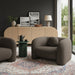The Emory Chair draped in the rich boucle fabric is a sight to behold. Its captivating elegance is matched only by its comfort, making it the epitome of style and relaxation. The texture of the fabric adds depth and dimension to the chair, making it a stunning addition to any room. With its sleek design and cozy feel, the Emory Chair is the perfect place to unwind and indulge in a moment of pure luxury.