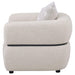 • Generously scaled accent chair in beige finish with wide curved arms and sculptural silhouette