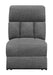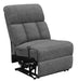This armless non-power recliner brings flexibility and comfort to modular sectional configurations. Upholstered in soft charcoal fabric, it features plush cushioning and a channel-tufted backrest for ergonomic support. The manual reclining function allows for smooth adjustments, providing personalized relaxation. Designed to seamlessly blend with other sectional components, this piece enhances both comfort and versatility in any seating arrangement.