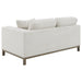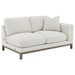 • Textured upholstery in a warm sand hue, complements the fixed solid wood pedestal base