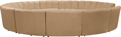 Create a seating group that works for every possible situation with this Infinity 12-piece sectional and other pieces in the Infinity collection. Upholstered in soft Camel velvet material that feels great against the skin and offers long-wearing beauty, this piece fits with other Infinity items for an infinite number of combinations that get your seating requirements just right but that look just as nice when used on their own.