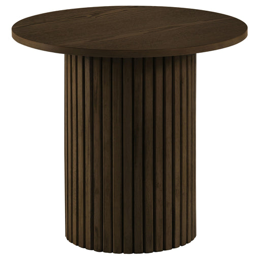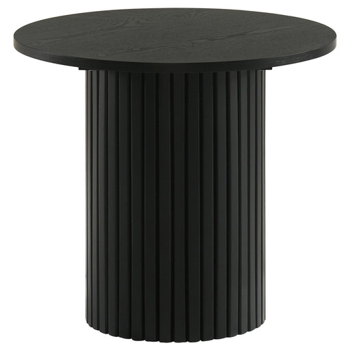 CoasterRound end table introduces sculptural character with a smooth circular top set over a bold fluted pedestal base. Vertical reeding wraps the cylindr...