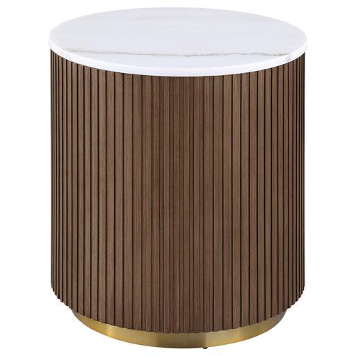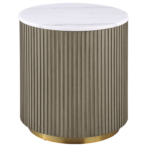 CoasterAn end table crowns a reeded drum base with a round white marble top, delivering sculptural contrast in a compact footprint. Marble rests on engine...