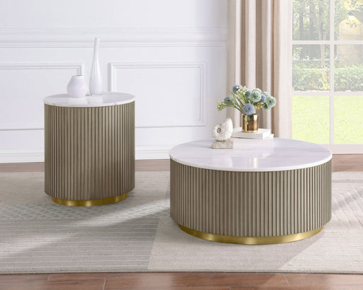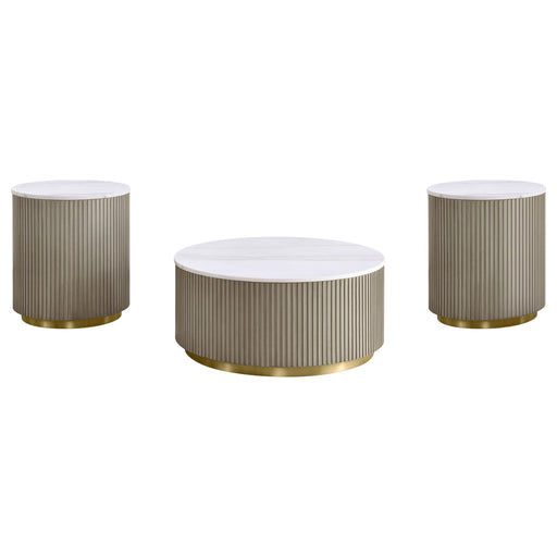 CoasterA coffee table set brings cohesive presence to a room with matching round white marble tops, reeded drum bases, and slim metal ring accents. Marble...