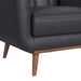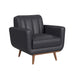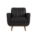 The Horizon Chair with Wood Front exudes the coveted charm of mid-century modern style. Built with a frame fully upholstered in quality faux leather, this piece is built for durability. Comfortable foam cushioning, decorative tufting on the backrest, and track arms forming sleek and modern lines culminate to mark thoughtful design, while an exposed front rail and wood legs highlight excellent craftsmanship. For a refined and sleek addition to your living space, the Horizon Chair with Wood Front delivers in quality and style.