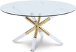 Bring modern pizzazz to your living room with this Mercury Acrylic Table by Meridian Furniture. The base features a pedestal design with acrylic gold legs for a touch of contemporary fun. The tempered glass top offers plenty of room for holding items like framed pictures or magazines. The top is clear, so you can easily see the beauty of the metallic legs showing through, giving your living room or den a little something extra.