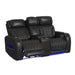 Upgrade your living room’s décor with the Prime Time P3 3PC Living Room Set. The power recline, headrest, and lumbar functions maximize comfort, elevating moments of repose. Features like LED lighting and the sofa’s drop-down table with reading lights add modern flair, while wireless charging, metal cupholders, and hidden storage in the armrests add practical convenience to all pieces. Luxurious 100% leather upholstery in a versatile black finish makes this set easy to pair with various décor styles and enhances durability. For a refined addition of style and comfort, the Prime Time P3 3PC Living Room Set delivers.