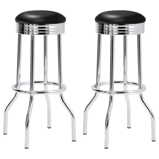 CoasterChannel the charm of a classic soda shop with this vintage-style swivel bar stool. A cushioned black leatherette seat crowns the top, resting on a ...