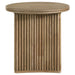 This round coffee table set pairs sculptural shape with organic finish for a refined living room statement. Featuring a thirty-six inch round coffee table and a matching round end table, both with curved pedestal bases and vertical reeding, the set offers warmth and architectural dimension. Finished in distressed light brown and built from engineered wood and ash veneer, the design balances modern softness with natural texture.