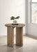 Designed with sculptural curves and architectural texture, this round end table brings warmth and refinement to any room. Its circular top rests over a curved pedestal base detailed with vertical reeding, all finished in a distressed light brown tone. Crafted from engineered wood and ash veneer, this accent table blends organic charm with structural rhythm—perfect beside a sofa, lounge chair, or bed.