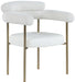 Comfort comes to mealtime with this Blake boucle fabric and vegan leather dining chair. This lovely chair is just the right choice for your modern dining room, with its curved back that cradles you in comfort while you wine and dine the night away. A thickly padded soft lack vegan leather seat lends this chair a sleek, upscale look while ensuring its ongoing performance and beauty. The chair's brushed brass finish protects its all-metal iron frame.