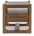 This end table sits comfortably at the intersection of modern lodge and farmhouse aesthetics. Your warm and welcoming disposition is reflected in the charming architectural elements and light brown glazed finish. Even with its poise, this table remains practical. A drawer and unique open shelf design encourage you to store and display in style.