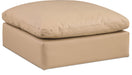 Give your space a whole new look with this tan Comfy vegan leather ottoman. This handsome ottoman fits nicely with other items in the Comfy collection and is a versatile seating option designed for adaptability, comfort and style. Wrapped in rich tan durable vegan leathered upholstery, this ottoman offers a plush embrace of overstuffed down feather cushions, carefully crafted to deliver the highest level of comfort. The perfect seat for creating an oasis for relaxation, this ottoman has thick foam surrounding its frame for added support and coziness.