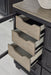This dresser is casual contemporary style simply done right. Its two-tone color scheme features a rich brushed main color accented with a beautiful dusty wood tone. With 11 soft-close drawers (three located neatly behind each door) this dresser offers plenty of storage to accommodate your wardrobe needs with ease.
