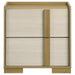 Complete your bedroom's modern elegance with this exquisite nightstand, perfectly designed to match your stylish bed. Inspired by contemporary Italian design, the nightstand features a sleek blend of natural wood tones and crisp white panels crafted from durable, easy-care melamine. The drawers, equipped with metal extension glides and pin-construction joinery, ensure smooth operation and lasting durability. The vertical lines of the natural finish hardware add a touch of sophistication, echoing the bed’s elegant design. Enhance your nighttime routine with this stylish and functional piece, offering a perfect blend of beauty and practicality.