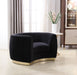 The perfect mix of velvet and stainless steel comes to life in your space with this Julian Chair. This bold velvet chair comes upholstered in rich, sumptuous-to-the-touch velvet to make a fashionable statement in your space. The curved back design lends it a modish touch, and the stainless steel trim around its base adds to its glitzy appeal. Stage this chair alone or with other pieces in the Julian collection.