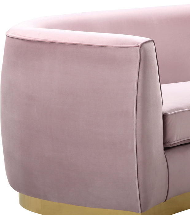The perfect mix of velvet and stainless steel comes to life in your space with this Julian Sofa. This bold velvet sofa comes upholstered in rich, sumptuous-to-the-touch velvet to make a fashionable statement in your space. The curved back design lends it a modish touch, and the stainless steel trim around its base adds to its glitzy appeal. Stage this sofa alone or with other pieces in the Julian collection.