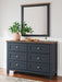 Add homespun charm to your restful retreat. A modern take on a timeless silhouette, this dresser and mirror set pairs a dark slate blue finish with a light brown top. Drawer fronts and legs in a classic Shaker style bring an air of beautiful simplicity to the bedroom. Whether it's part of a charmingly curated guest suite or a casually carefree kids room, this set is a welcome addition.