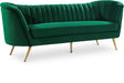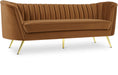 Lean back and lounge in luxurious style on this stunning Margo velvet sofa by Meridian Furniture. This contemporary sofa features plush velvet upholstery that is both classy and sumptuous against your skin, a single seat cushion and rounded arms that curve into a low, rounded back, creating a perfect, modern piece for your home. stainless steel legs support this sofa and provide stunning contrast to the sofa's plush, fabric.