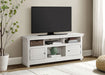Complete a media center in your inviting home with a modern farmhouse TV stand. It's an approachable design with roughhewn wood details that create texture and dimensionality in your living space. Two shelves and six compartments create ample storage, perfect for everything from peripherals and accessories to personal decor. The media console features a clean-lined silhouette with a slim profile, perfect for a flat panel or wall-mounted television. This TV stand accommodates televisions up to 65 inches.