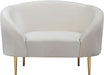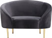Get comfy while remaining chic in this elegant Ritz velvet chair. Plush-colored upholstery provides a soft texture that is pleasing to the senses, while its curved design offers a contemporary touch to your home furnishing. metal legs complement the chair's sophisticated color, creating a gallant piece anyone would be proud to display in their home.