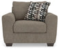 Transitional and right on trend. This oversized chair's upholstery is a delightful change from the ordinary, with hints of soft brown giving the gray hue added depth. It’s punctuated with a chic accent pillow in an eye-catching, stylized stripe design. Whether you're hosting friends and family or relaxing solo, this chair invites homey, comfortable character into your space.