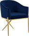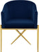 Spread elegance and modernity to your dining room with this Xavier velvet dining chair from Meridian Furniture. This beautiful chair features a simple barrel seat with a plush cushion and back, ensuring that every meal is a comfortable one. The steel legs provide durable support while you sit, and an "X" leg in the back lends the chair an uber-modern vibe. finishing on the base is sleek and chic, giving this chair a contemporary edge that's well at home in any modern dining room. Sleek velvet upholstery is durable and tough yet soft against your body, elevating meal times to a luxurious experience.